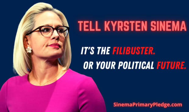 Help us put Sinema on notice: it’s time to choose. The filibuster or democracy. The filibuster or progress. The filibuster or her political future.